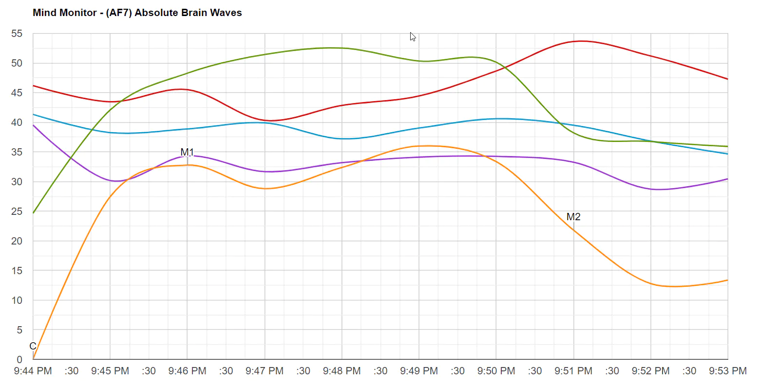 - I mention the word “exclusive” precisely to convey the point that these experiences only occur when there is high activity in the Front-Right (AF8) sensor and not exactly on the Front-Left (AF7) sensor. After M2 it can be said that I entered in some sort of artistic flow state (as a listener), and that explains whyBetaandGammadropped in AF7 but increased even further in AF8.