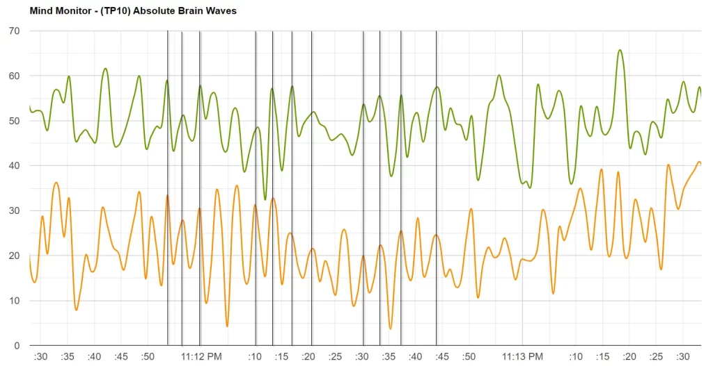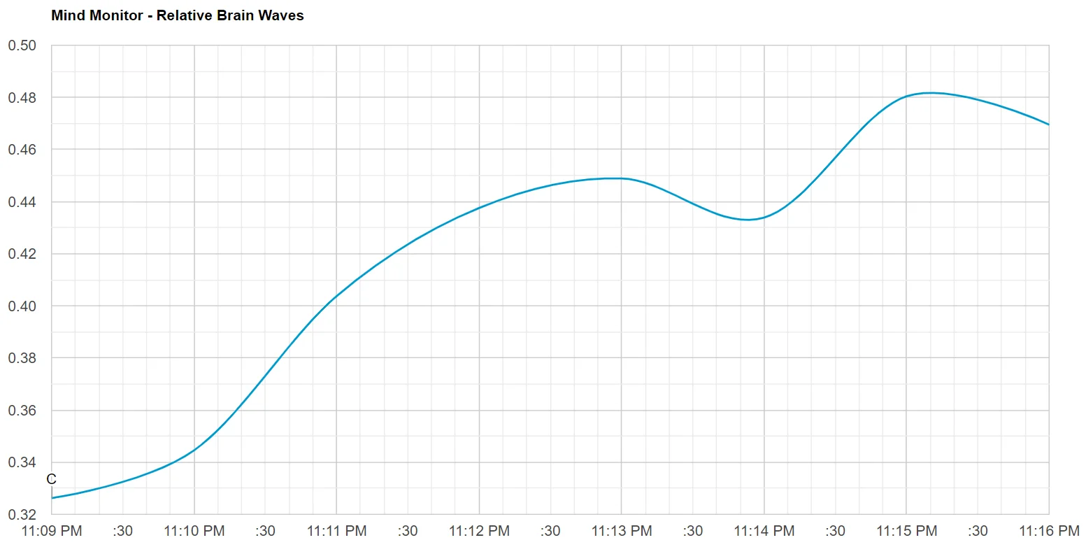 - Thetahas second-place dominance across most of the session, however, this is most likely due to me being in a calm state than it is a result of entrainment. So we’ll have to keep looking for clearer entrainment signs elsewhere.